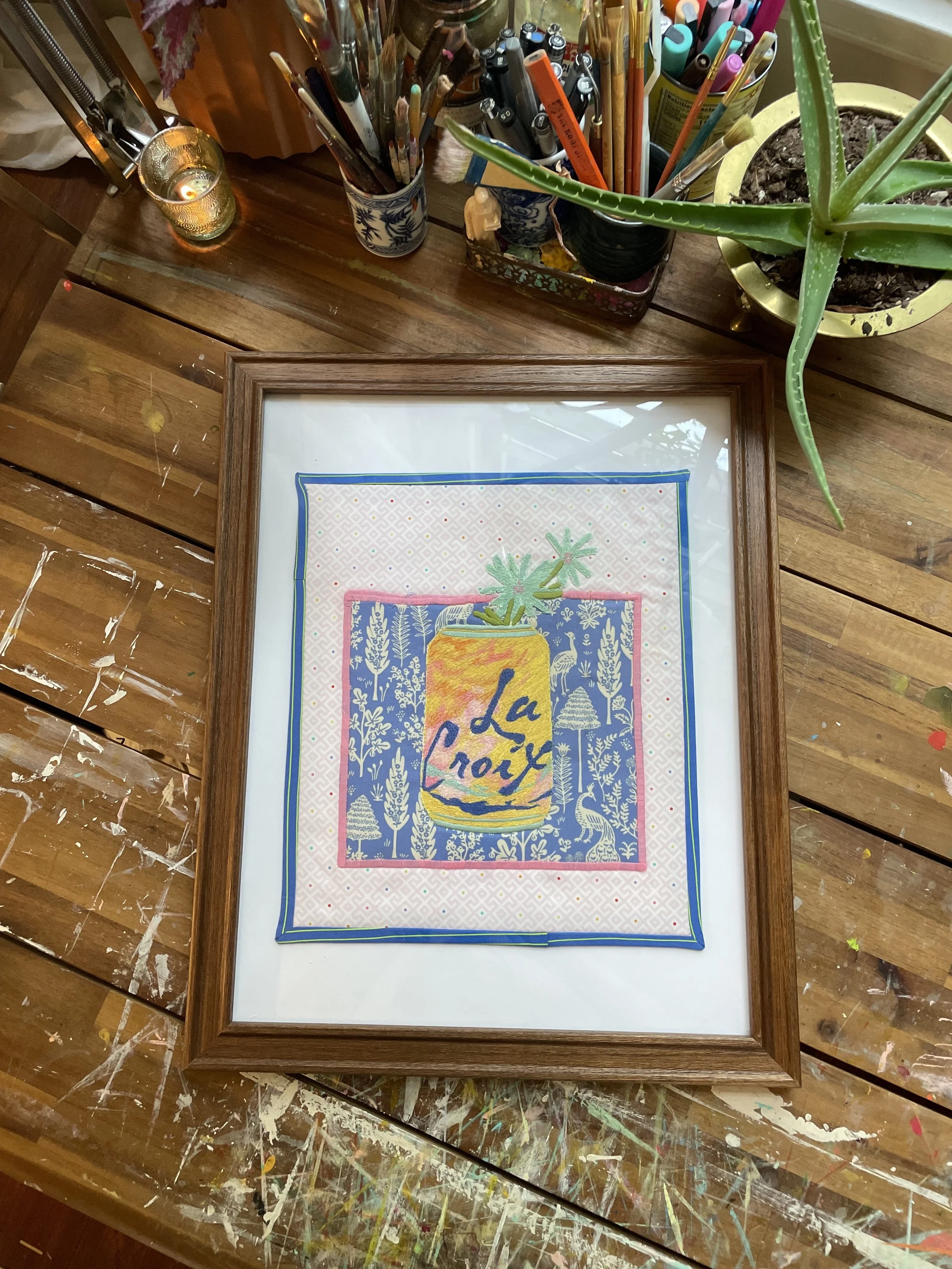 Original textile art! TheLa Croix detail is completely thread painted, using a free motion stitch on a basic sewing machine the artist “paints” using only thread. The fabric used is found and new, creating a completely unique piece of art every time.